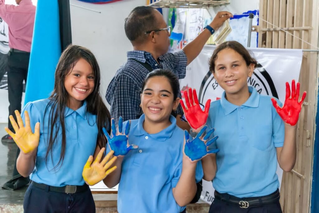 La sonoridad de la gaita animó a los asistentes, mientras a un lado del escenario una escena llenó de entusiasmo a las estudiantes: Abigaíl Ríos y Glorianny Hernández, ambas de Primer Año y, Anyerlín Pacheco, de Segundo,quienes estamparon sus palmas en amarillo, azul y rojo, arrancando así el simbólico gesto de dejar las primeras huellas en el lienzo.