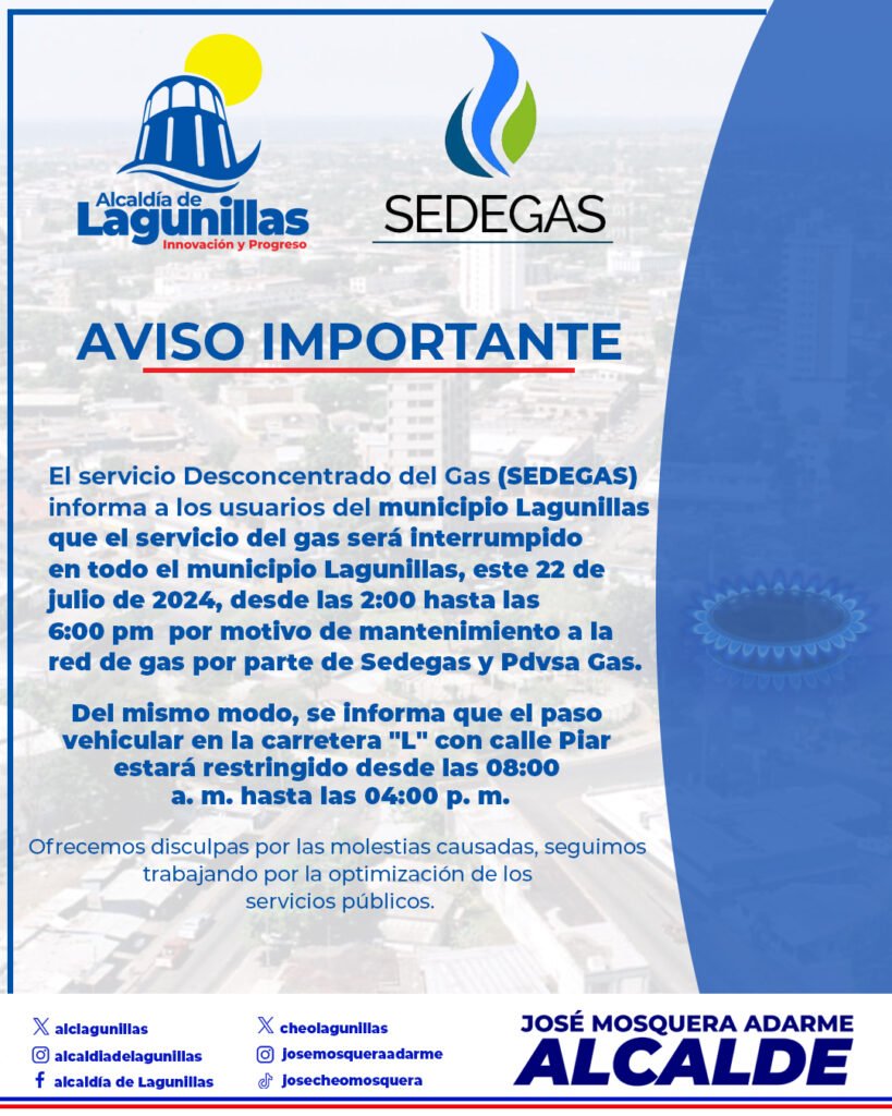 La Alcaldía de Lagunillas informa a todos los ciudadanos que el servicio de gas será interrumpido en todo el municipio este 22 de julio de 2024, desde las 2:00 hasta las 6:00 pm. Esta interrupción se debe a labores de mantenimiento en la red de gas llevadas a cabo por Sedegas y Pdvsa Gas.