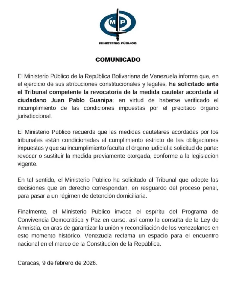 Sin embargo, poco después, su familia reportó que un grupo de hombres armados en vehículos sin identificación lo interceptó en Caracas, lo que opositores calificaron como un secuestro. La Fiscalía venezolana informó que la excarcelación fue revocada por un supuesto “incumplimiento de medidas cautelares”, sin especificar cuáles, y que Guanipa quedaría bajo arresto domiciliario para “garantizar el proceso penal”.