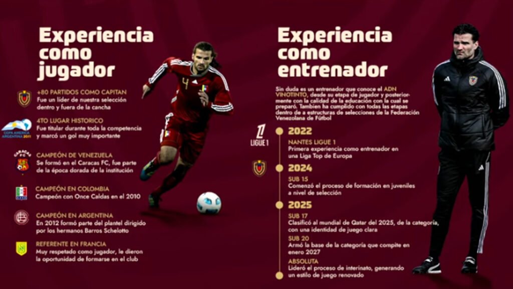 Vizcarrondo, de 41 años, fue uno de los referentes históricos de la Vinotinto como futbolista, con más de 80 partidos internacionales y participación en cuatro Copas América. Tras su retiro, se formó como entrenador en Europa y posteriormente se integró al proyecto de desarrollo de la FVF.